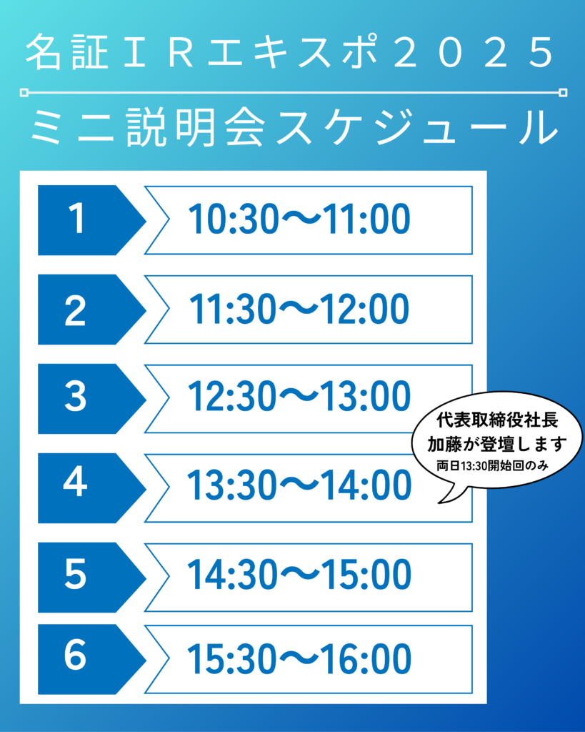 当社は 9月5日(金)及び 6日(土)に名古屋市の吹上ホールにて開催される「名証IRエキスポ2025」へ出展いたします。当イベントは名古屋証券取引所が主催する日本で最も歴史ある展示会形式のIR イベントです。当社の出展は今回が初めてとなります。