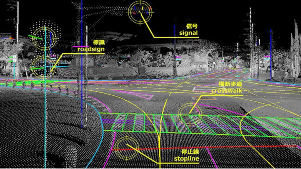 道路情報をはじめ、建物やガードレールなど周囲情報を地図データとして作成します