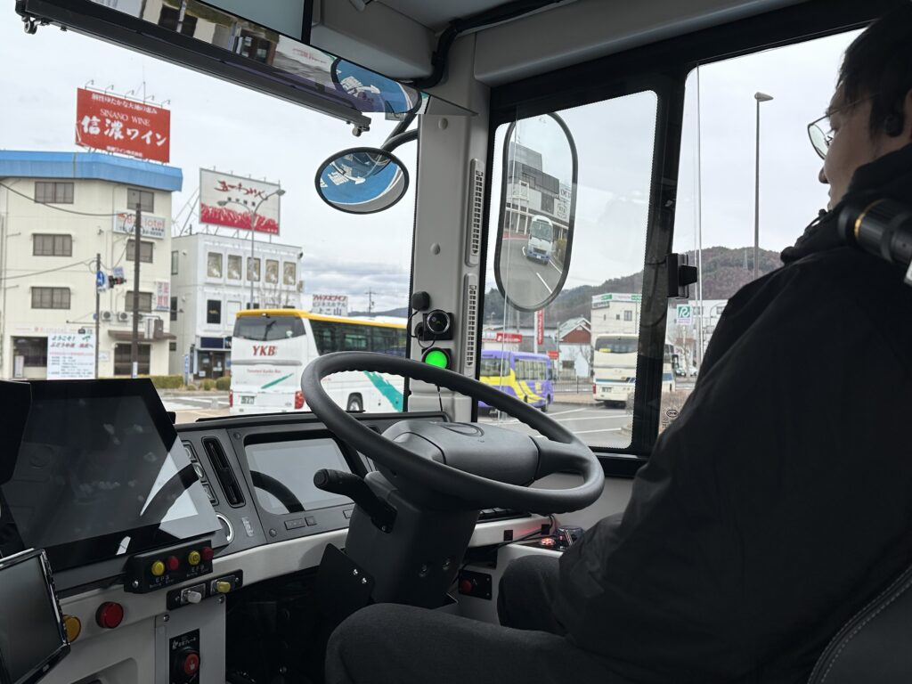 一般試乗に先立ち、3月13日に関係者向け試乗会が行われ、当社社員も参加いたしました。本試乗会は、塩尻市、塩尻市振興公社、アルピコ交通株式会社、アルピコタクシー株式会社、株式会社ティアフォー等と連携し、実路線環境下において車両や運行体制・安全面の最終確認および事前検証を目的として実施されました。
